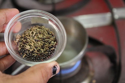 Now make seasoning by heating ghee and crackling mustard and cumin. Add in asafoetida and mix well.