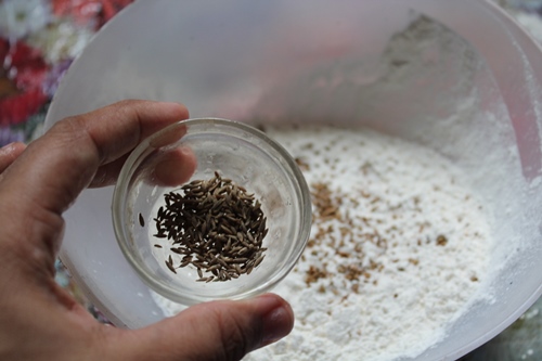 Take flour, salt, chilli powder, ajwain, cumin, asafoetida in a bowl. Mix well.