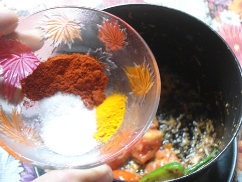 | Add in chilli powder, turmeric and salt |