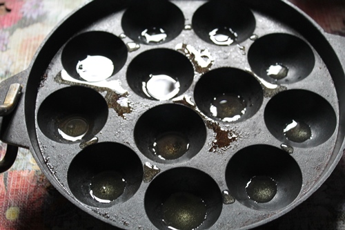 Pour spoonful of batter in each paniyaram. Cook for 2 mins till the bottom is crisped up. Flip over and cook for 2 more mins.